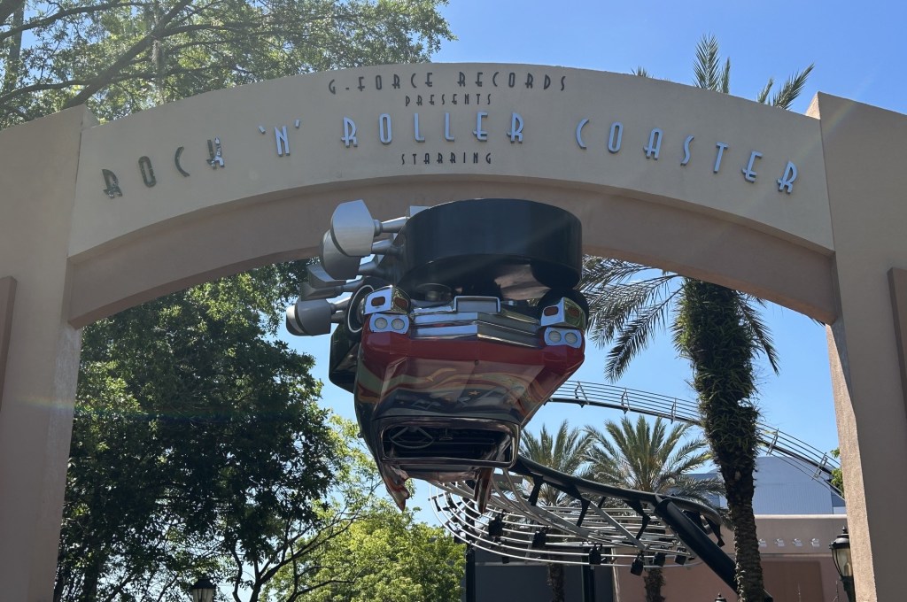 The giant guitar in front of the indoor coaster building is being repainted. It is currently covered with scaffolding and blue tarps. The upside-down car that floats above the attraction’s courtyard entrance has already been revised, and the word “Aerosmith” has been removed from the archway.