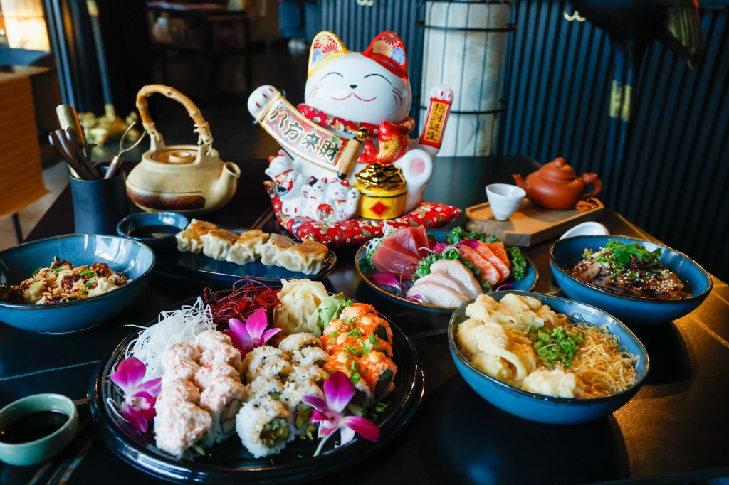 From left to right, Molly Ward from “The Monroe.” Michael Nguyen, owner of Maki Hibachi. Chefs Jerry and Jackie Lau of Moon Wok. East Meets West organizer Maxine Sudarma will be giving a sampling of the dishes that will be featured at the festival. (Rich Pope/Orlando Sentinel)
