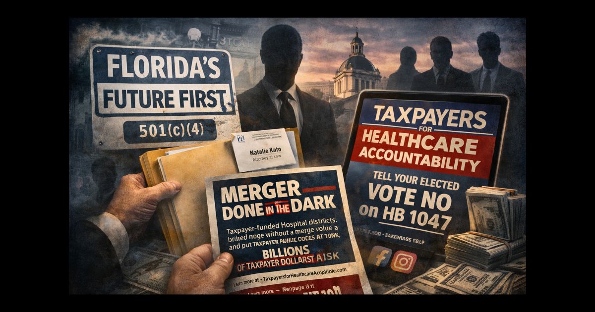 This is the second part of a series on money and influence in high-stakes health policy decisions, examining how a Tallahassee lawyer, a private law 501(c)(4), and a “taxpayer” branded advertising campaign helped shape the debate over the Broward hospital bill while keeping financial backers out of the public eye.