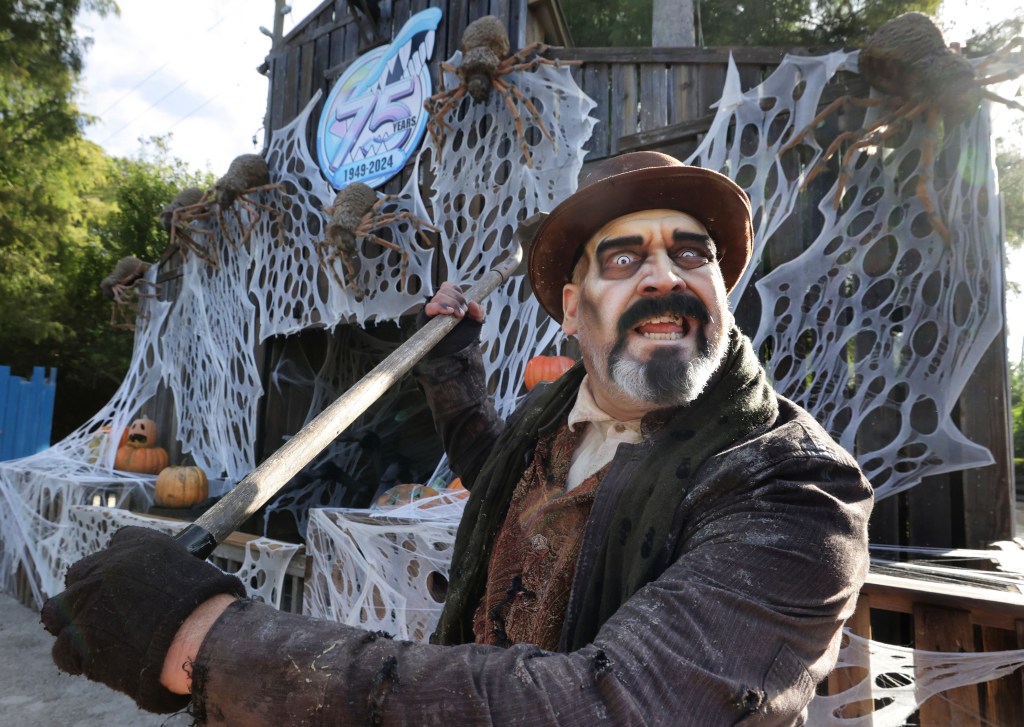 Cyrus the Gravedigger unveils scary characters during a tour of an abandoned movie theater at Gatorland’s 7th Annual Gators, Ghosts and Goblins event during a preview, Wednesday, Oct. 8, 2025. The family-friendly, fun-and-frights celebration runs from Oct. 11 to Oct. 26 and features spooky scenes, chilling characters, a haunted theater, children’s Halloween activities and animal meet-n-greets. (Joe Burbank/Orlando Sentinel)