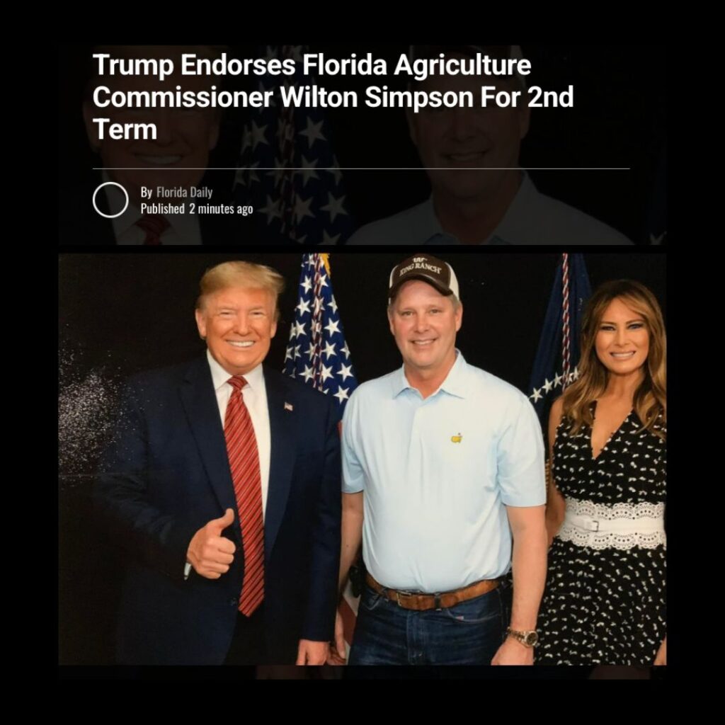 “Wilton Simpson is a powerful and popular Agriculture Commissioner in my “home” state of Florida, a state I love, and he has been elected six times, including a record-breaking 6.1 million votes (to date) in 2024!