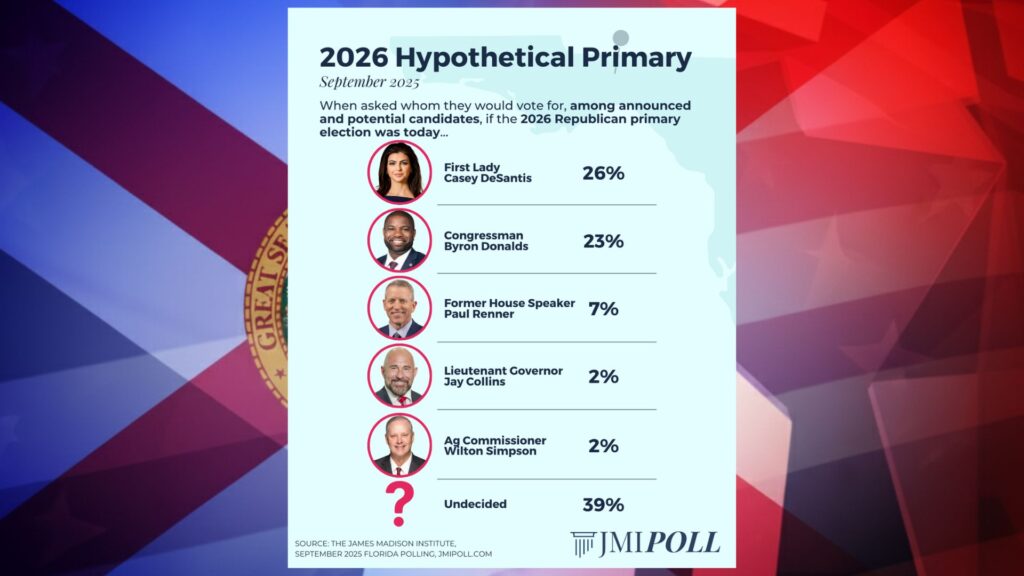 But including Florida’s First Lady Casey DeSantis, she leads 26-23% Trump-approved Donald. Renner is 7%, Governor Jay Collins of Li throughout Florida is 2%, and Florida Agriculture Commissioner Wilton Simpson, 39%, and 39% is still undecided.