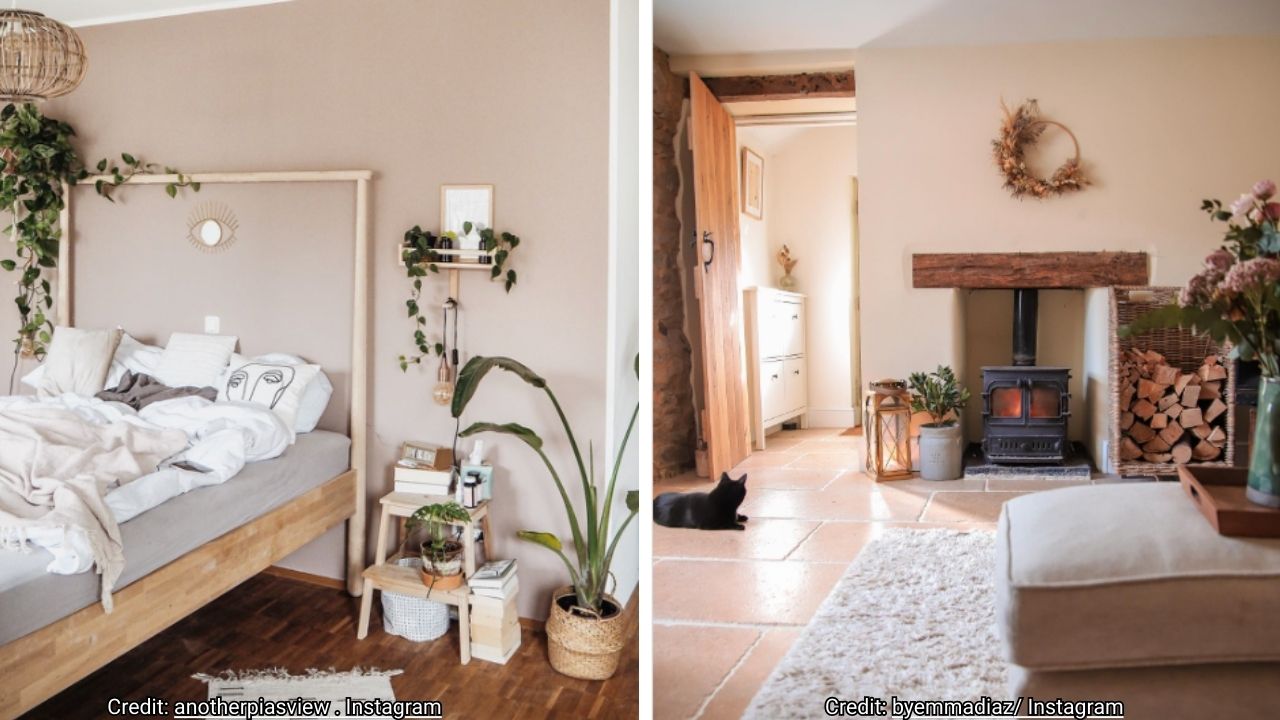 Large windows, plants, natural fibers, wood features, simple and calm color scheme
